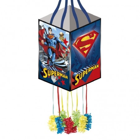 Hermosa piñata con diseño de Superman en forma de caja rectangular, con imágenes en las 4 caras, con cintas de colores para tirar de ella, el mejor e ideal complemento para tu fiesta temática,