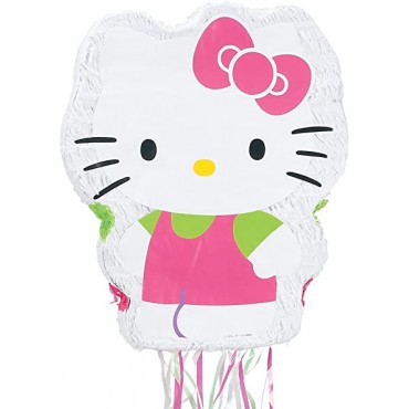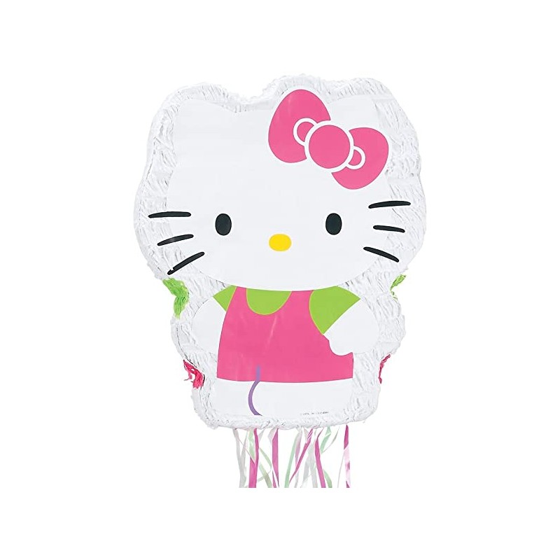 Hermosa piñata con diseño de Hello Kitty en ambas caras, con cintas de colores para tirar de ella, el mejor e ideal complemento para tu fiesta temática,