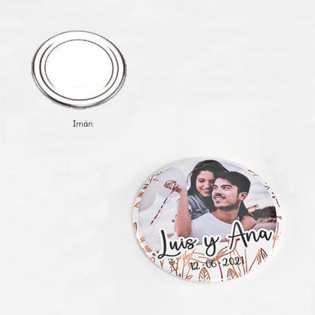 Chapas de imán personalizadas perfectas para tu boda. Detalle ideal para regalar a los invitados de tu boda.
