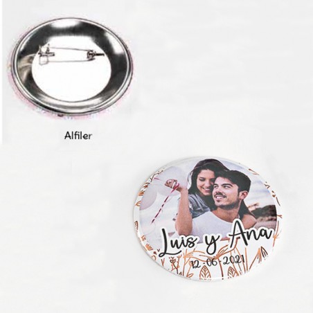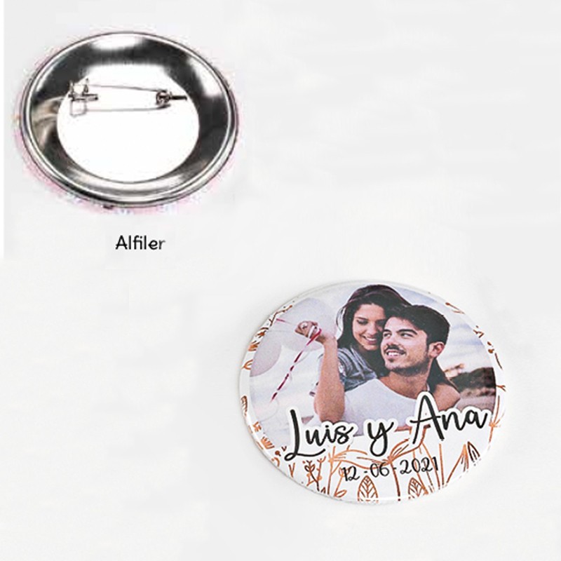 Chapas de alfiler personalizadas perfectas para tu boda. Detalle ideal para regalar a los invitados de tu boda.