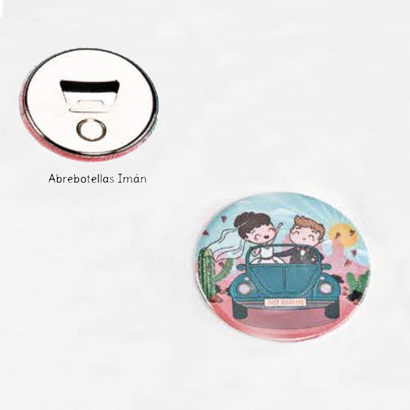 Chapas de imán abrebotellas con imagen de pareja en coche perfectas para tu boda. Detalle ideal para regalar a los invitados de tu boda.