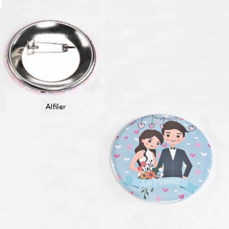 Chapas de alfiler con dibujo de pareja y ramo perfectas para tu boda. Detalle ideal para regalar a los invitados de tu boda.