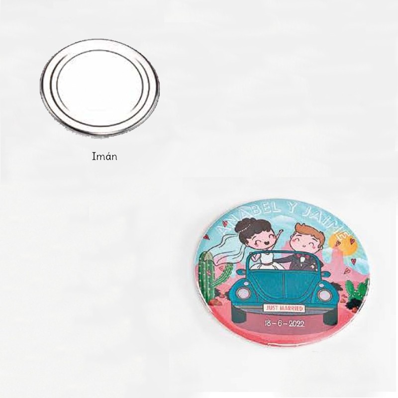 Chapas de imán con dibujo de pareja en coche y personalizado con los nombres de los novios y la fecha de boda. Detalle ideal para regalar a los invitados de tu boda.