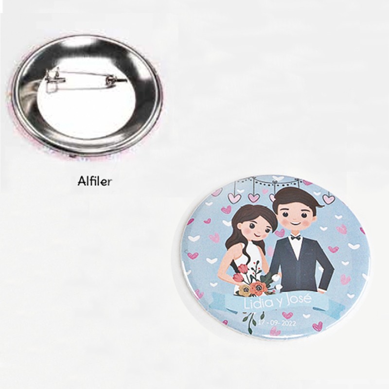 Chapas de alfiler con dibujo de pareja y ramo personalizada con los nombres de los novios perfectas para tu boda. Detalle ideal para regalar a los invitados de tu boda.