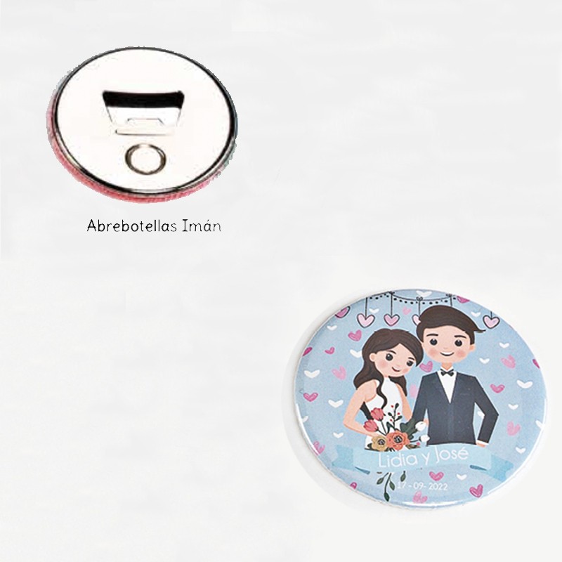 Chapas de imán abrebotellas con dibujo de pareja y ramo personalizada con los nombres de los novios perfectas para tu boda. Detalle ideal para regalar a los invitados de tu boda.
