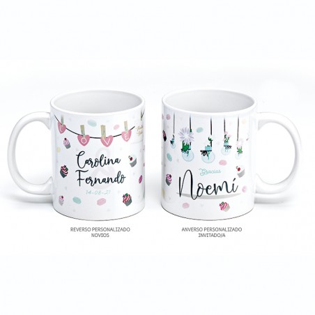 Taza de cerámica con un hermoso diseño de corazones, dulces y decoraciones. Detalle ideal para regalar a los invitados de tu boda.