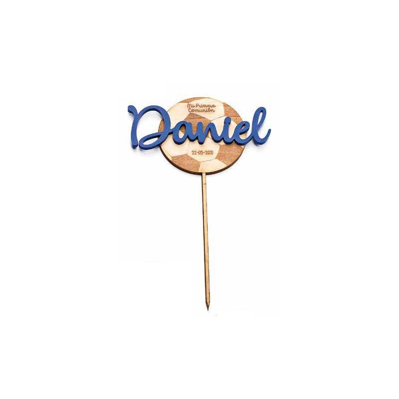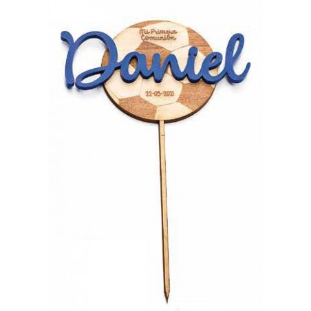 Cake Topper Balón Madera Nombre metacrilato azul y fecha personalizado, ideal para tus tartas o mesas temáticas