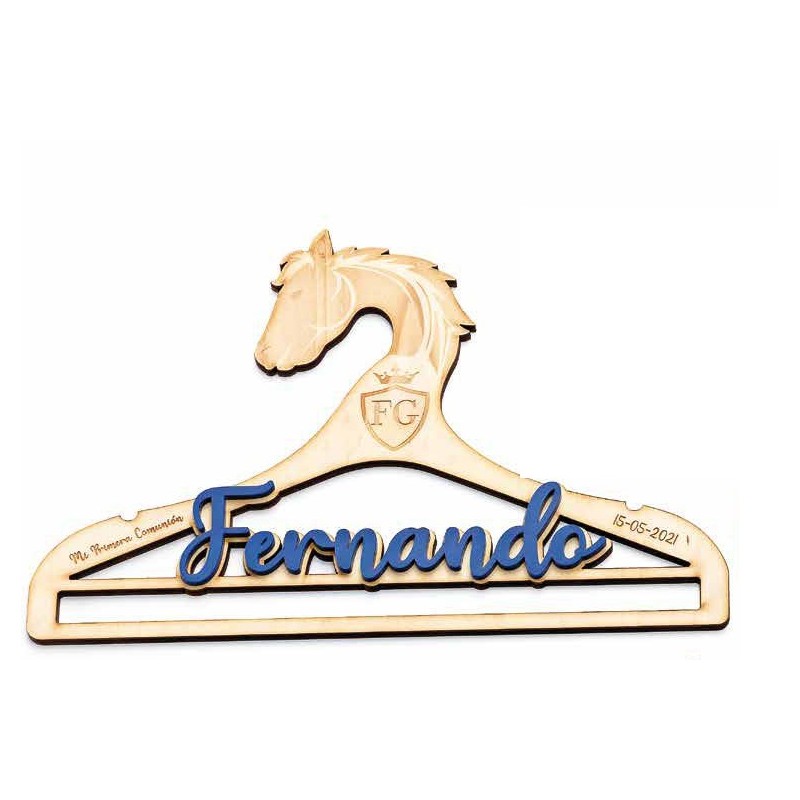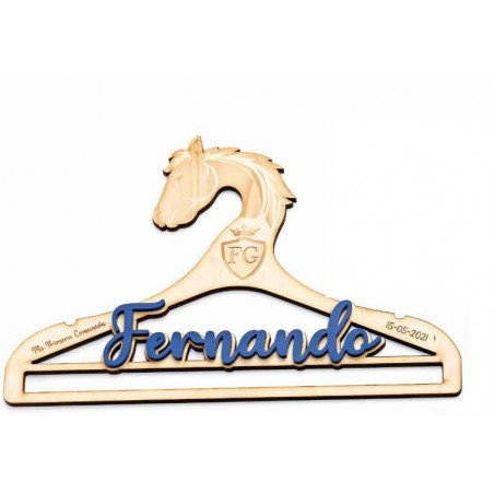 Hermosa Percha Caballo Madera nombre metacrilato azul iniciales y fechas personalizados, ideal para tu temática de Primera Comunión de tu niño.