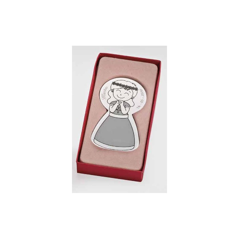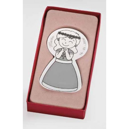 Imán niña Comunión , muy original para regalar a los invitados de la Primera Comunión de tu niña. Este imán de metal tiene la forma de una niña que va vestida de comunión.