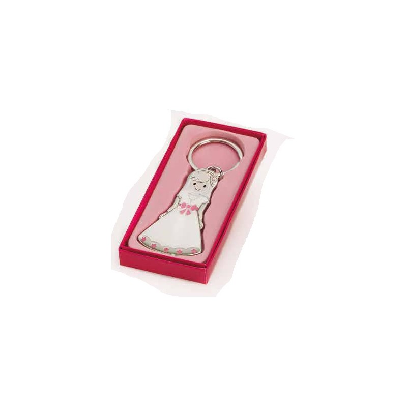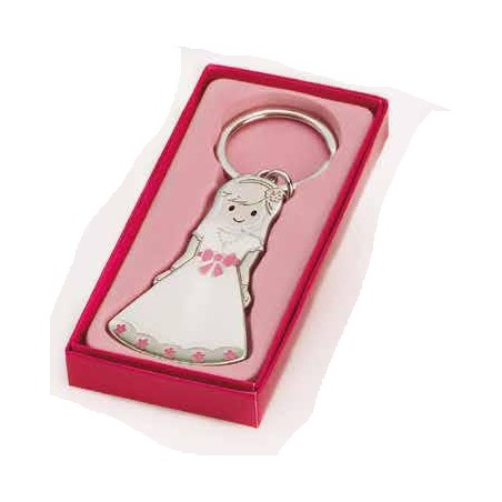 Un llavero niña Comunión Lazo Rosa, muy original para regalar a los invitados de la Primera Comunión de tu niña. El llavero de metal tiene la forma de una niña hermosa que va vestida de comunión.