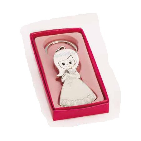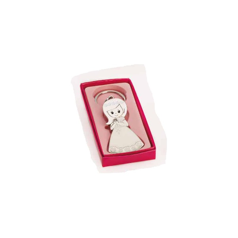 Un llavero niña comunión corona, muy original para regalar a los invitados de la Primera Comunión de tu niña. El llavero de metal tiene la forma de una niña que va vestida de comunión.