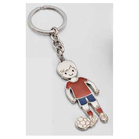 Un llavero niño Futbolista Camiseta roja, muy original para regalar a los invitados de la Primera Comunión de tu niño. El llavero de metal tiene la forma de un niño Futbolista.