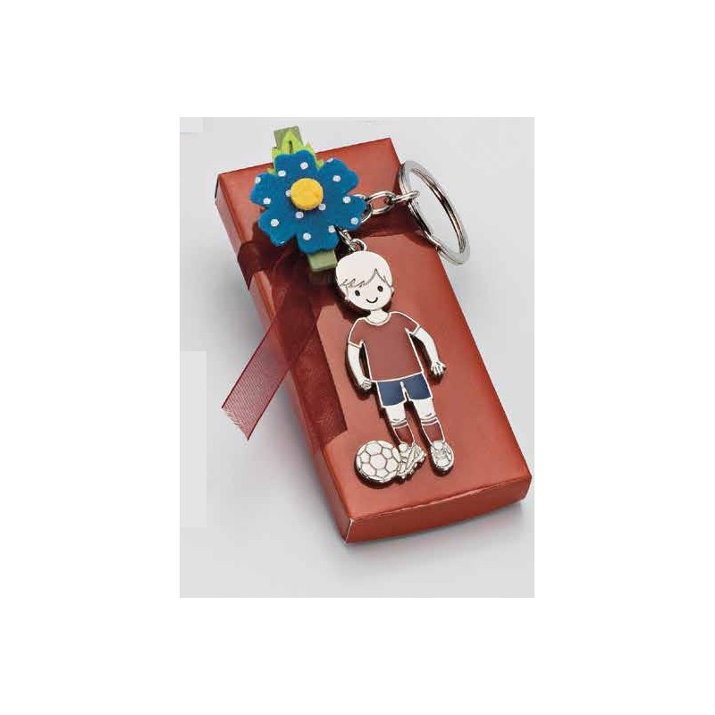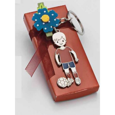 Llavero niño Futbolista Camiseta roja, muy original para regalar a los invitados de la Primera Comunión de tu niño. El llavero de metal tiene la forma de un niño Futbolista.