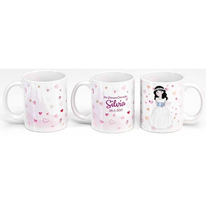 Hermosa taza niña comunión corazones con caja de regalo (Personalizable), el ideal regalo para tus invitados en la primera comunión de tu niña.